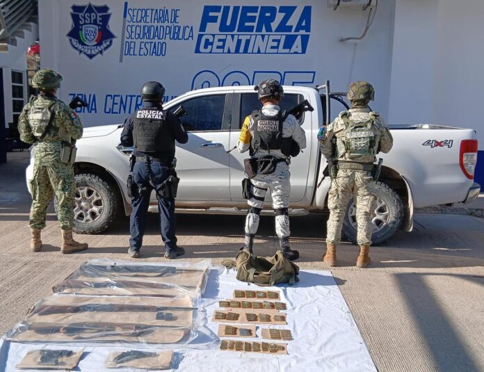 El mismo día, a través de un operativo en la comunidad El Pueblito, se aseguró una camioneta Ford Ranger 2019, color blanco, en cuyo interior se localizaron seis armas de fuego de diferentes calibres y 343 cartuchos útiles.