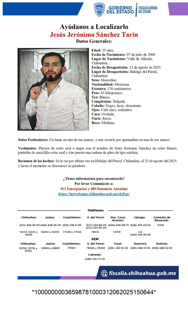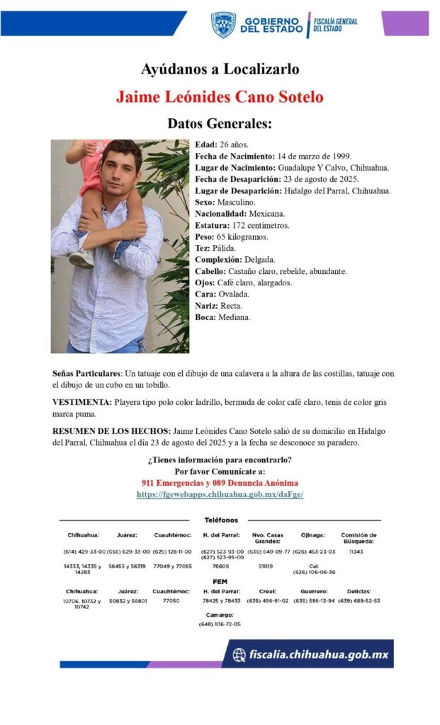 La Fiscalía de Distrito Zona Sur continúa con los trabajos de búsqueda para dar con el paradero de Jaime Leónides Cano Sotelo y Jesús Jerónimo Sánchez Tarín, reportados como desaparecidos el 23 de agosto del presente año en la ciudad de Parral.