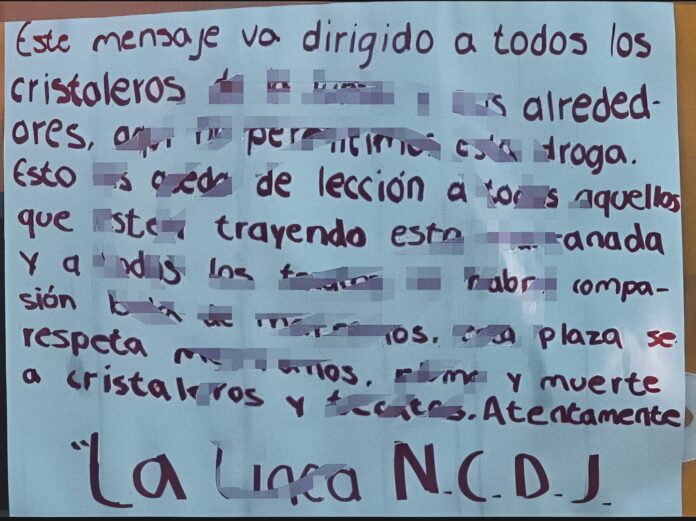 El hallazgo se produjo al amanecer, cuando pobladores de la zona localizaron los cuerpos en la base de las letras. En el lugar, las autoridades encontraron una lona de color blanco con letras rojas que contenía un mensaje dirigido contra los consumidores de la droga conocida como cristal y contra “tecatos”.