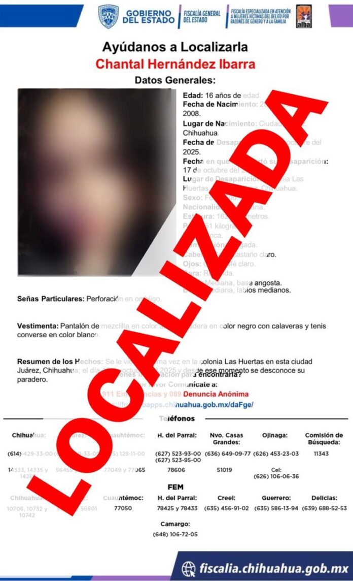 La Fiscalía Especializada en Atención a Mujeres Víctimas del Delito por Razones de Género y a la Familia de la Zona Norte, localizó a la menor de edad de iniciales C. H. I., de 16 años de edad, quien contaba con reporte de desaparición y/o ausencia, interpuesto ayer viernes 17 de octubre, en Ciudad Juárez.