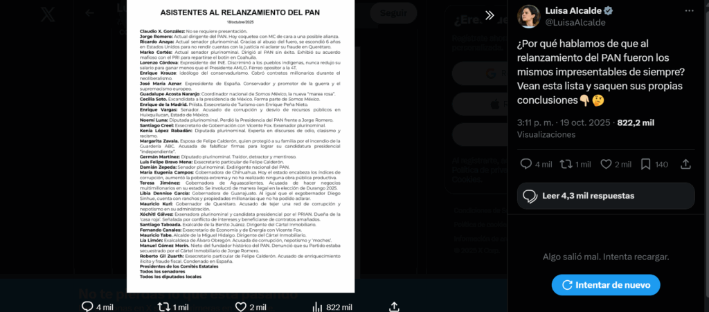 La gobernadora Maru Campos Galván anunció este martes la interposición de una denuncia por daño moral contra la dirigente nacional de Morena, Luisa María Alcalde. Esto después de que la morenista hiciera una publicación en la red social X con una lista de asistentes al relanzamiento del PAN y en la que junto a su nombre señala que Chihuahua encabeza los índices de corrupción, que aumentó la pobreza en la entidad y que el actual gobierno estatal no ha realizado obra pública. Ante eso, Maru Campos aseguró que ya está bueno.