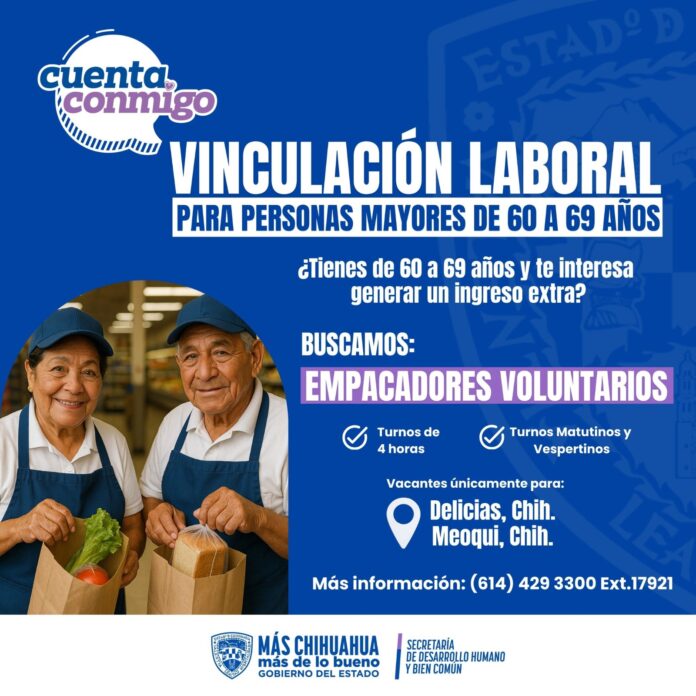 El Gobierno del Estado, a través de la Secretaría de Desarrollo Humano y Bien Común (SDHyBC) dio a conocer que se abrieron nuevas vacantes laborales dirigidas a personas de entre 60 y 69 años de edad, para integrarse como empacadores voluntarios en Delicias y Meoqui.