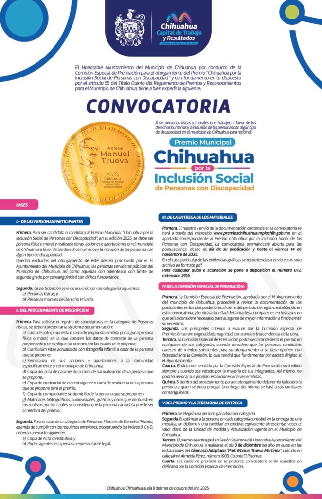 La Convocatoria del Premio Municipal Chihuahua por la Inclusión Social de Personas con Discapacidad 2025 cierra el viernes 14 de noviembre, por lo que aún hay tiempo para registrarse y participar.