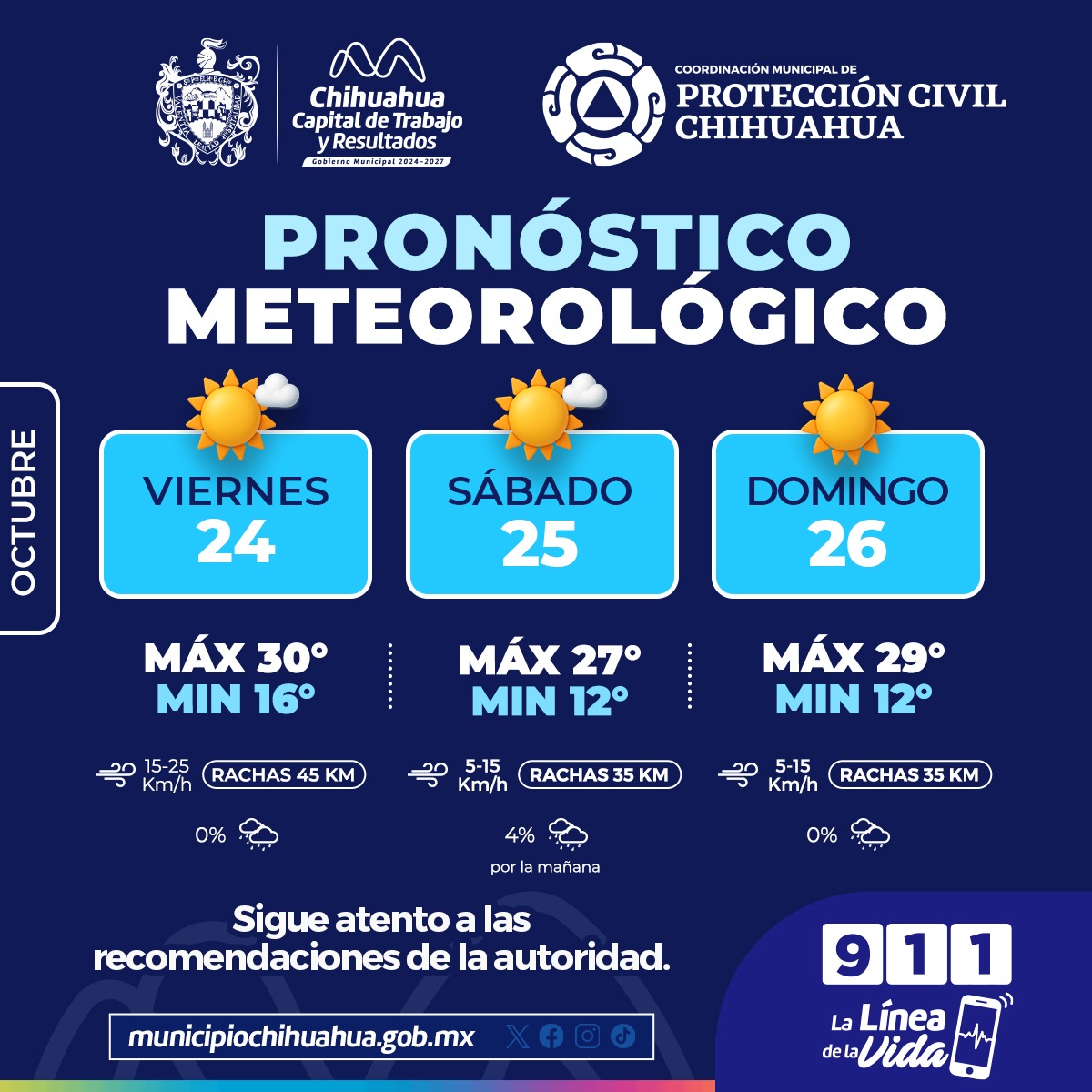 H. Ciudad de Chihuahua, Chih.- El Gobierno Municipal de Chihuahua, a través de la Coordinación Municipal de Protección Civil, informa que para este fin de semana se esperan condiciones mayormente soleadas, vientos moderados y muy baja probabilidad de lluvia.