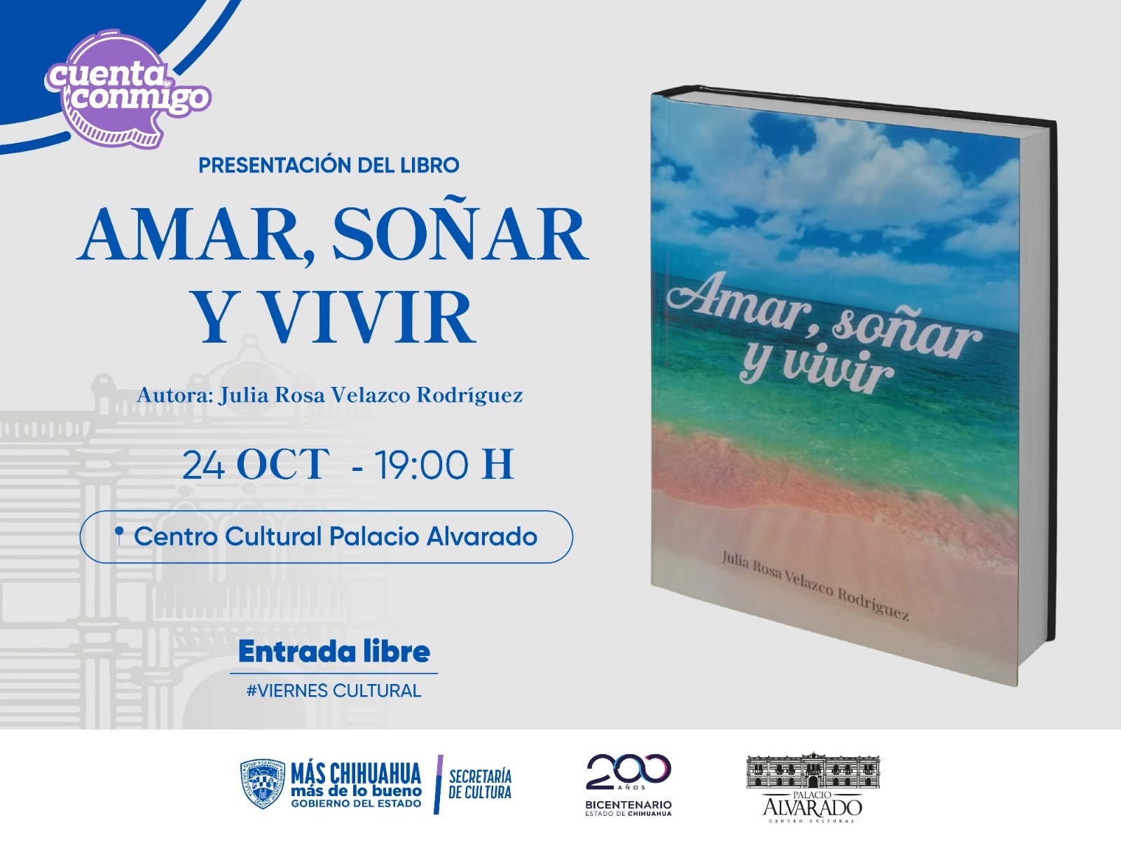 La Secretaría de Cultura, a través del Centro Cultural Palacio Alvarado invita a las y los parralenses a asistir a la presentación del poemario “Amar, Soñar y Vivir” de la escritora Julia Rosa Velazco Rodríguez, este viernes 24 octubre a las 7 de la tarde.