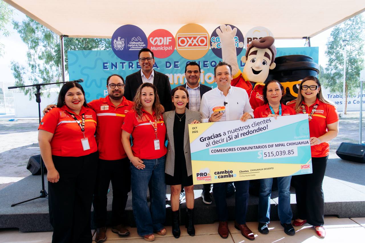 H. Ciudad de Chihuahua, Chih.– El alcalde Marco Bonilla y la presidenta del DIF Municipal, Karina Olivas, recibieron de la cadena comercial OXXO un cheque por 515 mil 39 pesos, producto del redondeo “Cambio x Cambio” realizado durante tres meses en más de 300 tiendas de la plaza Chihuahua Desierto, cuyos fondos se destinarán a fortalecer los comedores comunitarios del DIF Municipal.