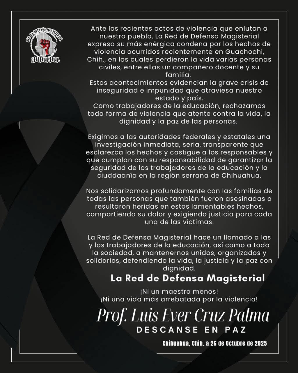 Ante los recientes actos de violencia que enlutan a nuestro pueblo, la Red de Defensa Magisterial expresa su más enérgica condena por los hechos de violencia ocurridos recientemente en Guachochi, Chih., en los cuales perdieron la vida varias personas civiles, entre ellas un compañero docente y su familia.