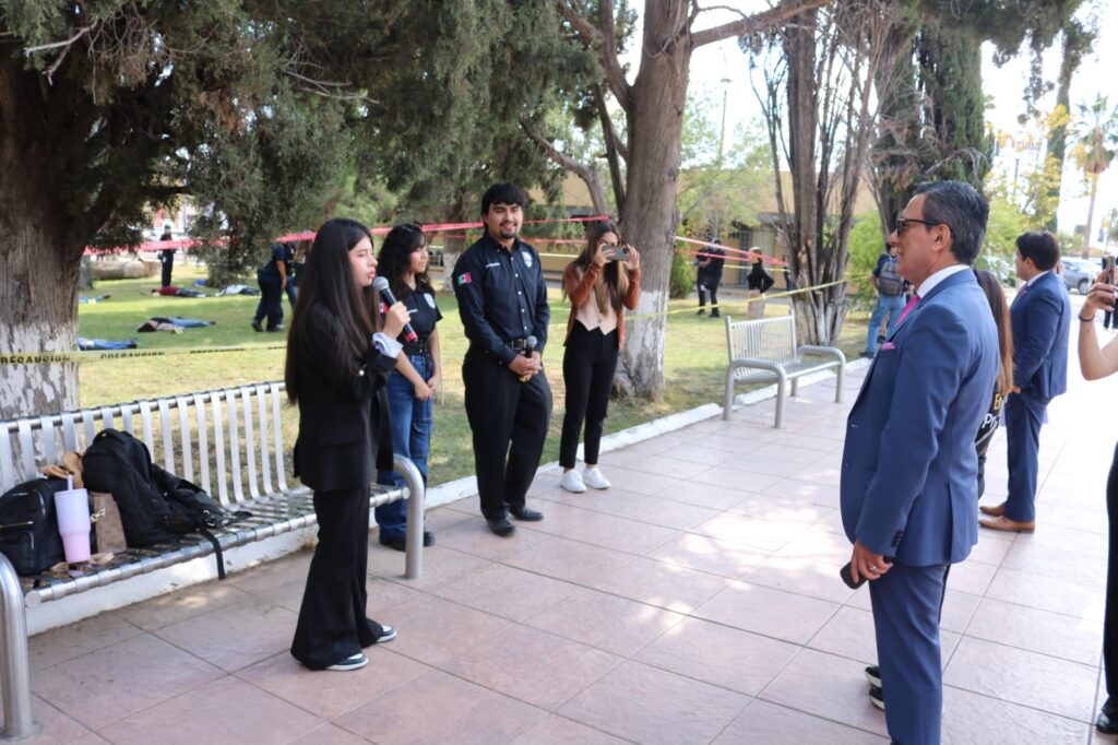El Director de la Facultad de Derecho, Mtro. César Gutiérrez Aguirre, acompañado por la directora del Instituto Chihuahuense de la Juventud, Lic. Fernanda Jazmín Martínez Quintero, directivos, personal docente y administrativos recorrieron cada una de las áreas, desde la escena del crimen, hasta las celdas donde estaban recluidas las mujeres.
