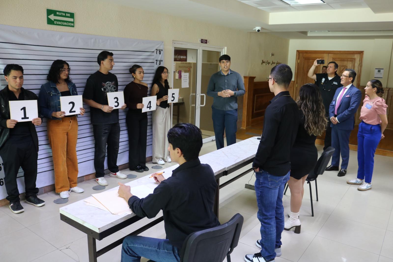El Director de la Facultad de Derecho, Mtro. César Gutiérrez Aguirre, acompañado por la directora del Instituto Chihuahuense de la Juventud, Lic. Fernanda Jazmín Martínez Quintero, directivos, personal docente y administrativos recorrieron cada una de las áreas, desde la escena del crimen, hasta las celdas donde estaban recluidas las mujeres.