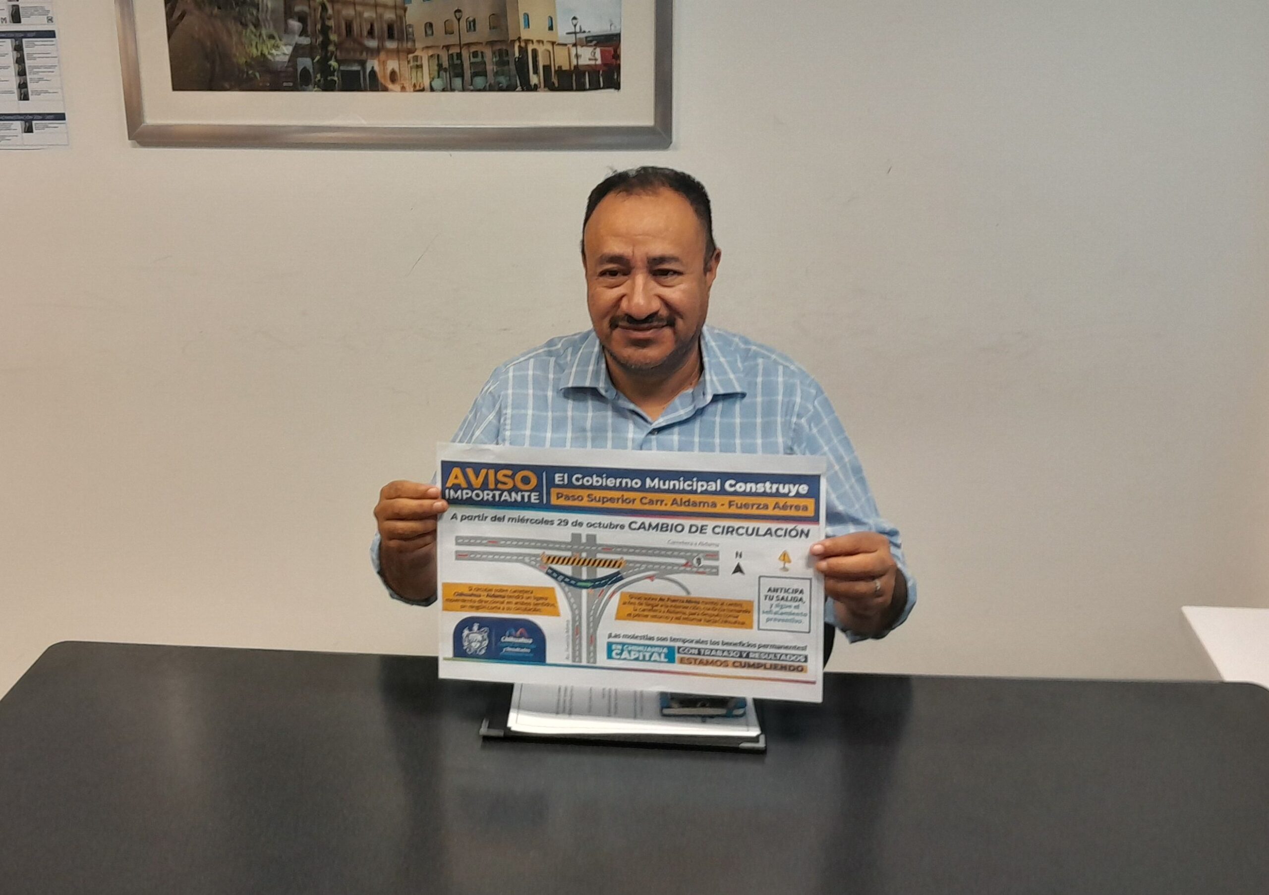 El director de Obras Públicas Municipales, Carlos Rivas, informó que a partir del 29 de octubre comenzarán los desvíos de circulación en la carretera a Aldama y la avenida Fuerza Aérea Mexicana, debido al inicio de la construcción del paso superior vehicular en ese cruce.