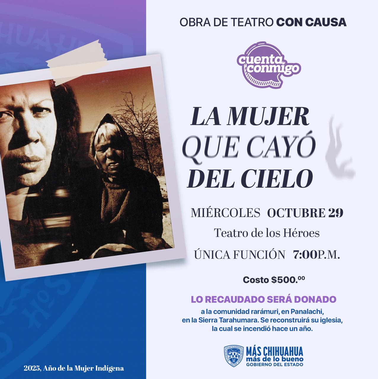 Este miércoles 29 de octubre se presenta en el Teatro de los Héroes la obra “La mujer que cayó del cielo”, cuyas ganancias se destinarán a la reconstrucción de la iglesia del Sagrado Corazón de Jesús, ubicada en Panalachi, municipio de Bocoyna.