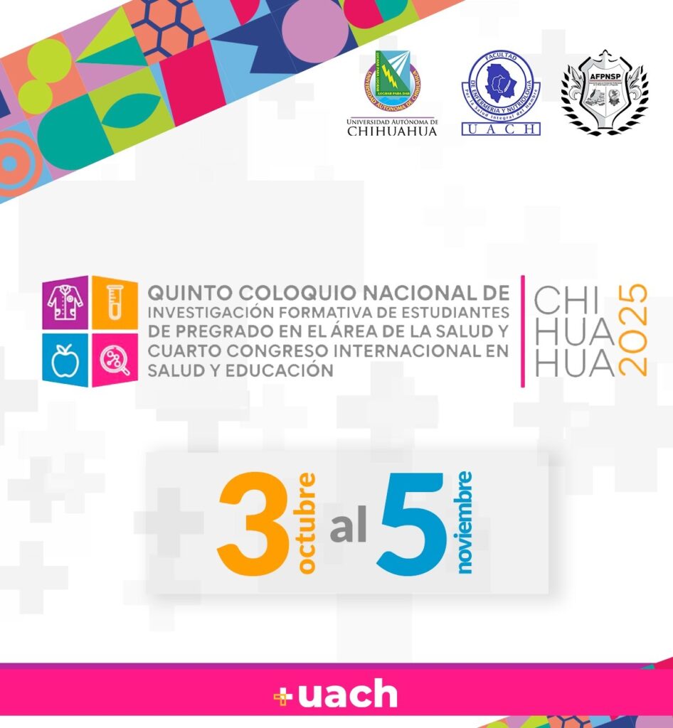 La Facultad de Enfermería y Nutriología de la UACH anunció la realización del Quinto Coloquio Nacional de Investigación Formativa de Estudiantes de Pregrado en el Área de la Salud y el Cuarto Congreso Internacional en Salud y Educación, que se llevarán a cabo del 3 al 5 de noviembre de 2025 en la ciudad de Chihuahua.