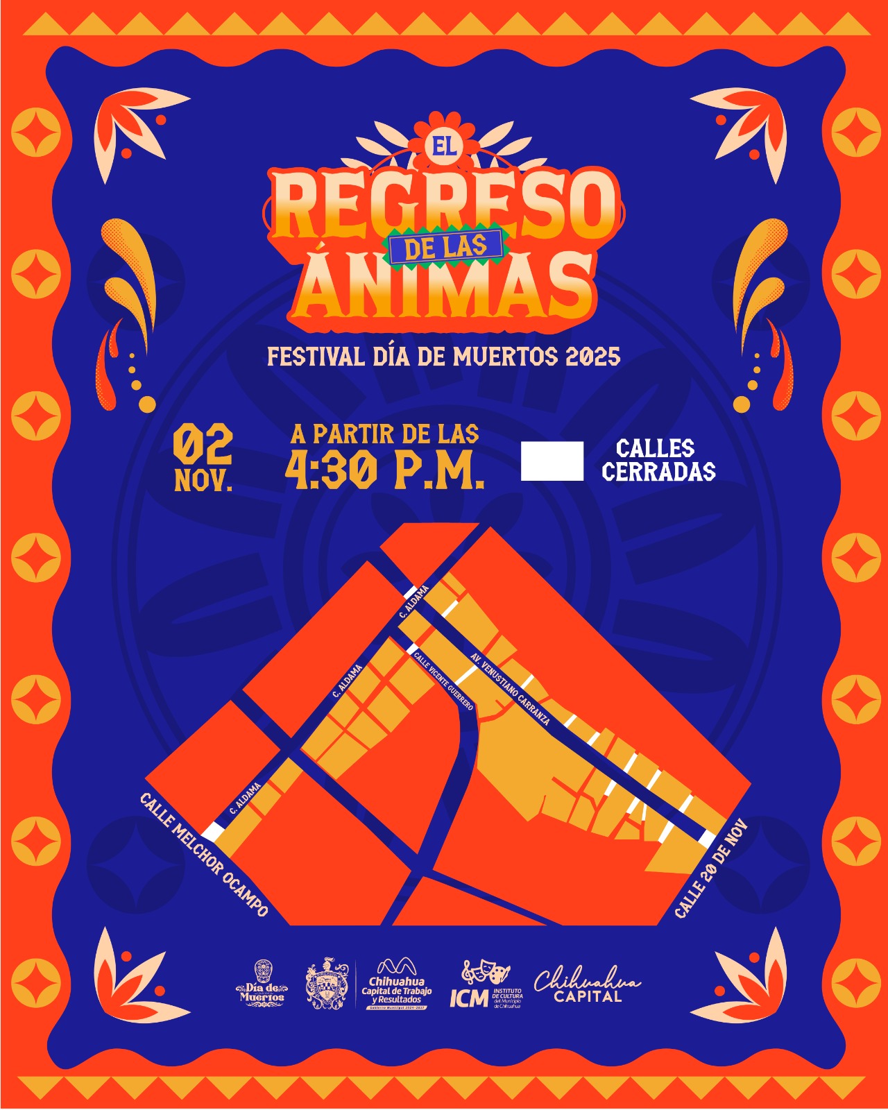 H. Ciudad de Chihuahua, Chih., a 29 de octubre de 2025.- Con motivo del desfile por el Día de Muertos y el festival «El Regreso de las Animas» en el Centro Histórico de la Capital, el Gobierno Municipal a través del Instituto Municipal de Cultura informa sobre los cierres viales que se realizarán este 2 de noviembre, para que conductores tomen precauciones y planifiquen sus rutas.