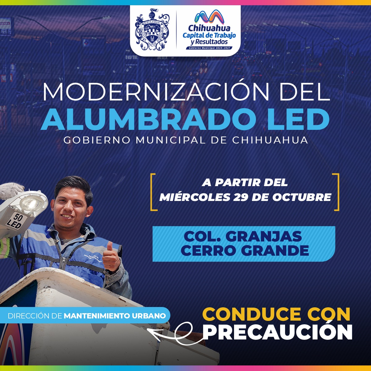H. Ciudad de Chihuahua, Chih., a 29 de octubre de 2025.- El Gobierno Municipal, a través de Dirección de Mantenimiento Urbano informa que, a partir de hoy miércoles 29 de octubre, se iniciará con la modernización de luminarias LED en la colonia Granjas Cerro Grande, beneficiando con estos trabajos a miles de vecinos del sector.