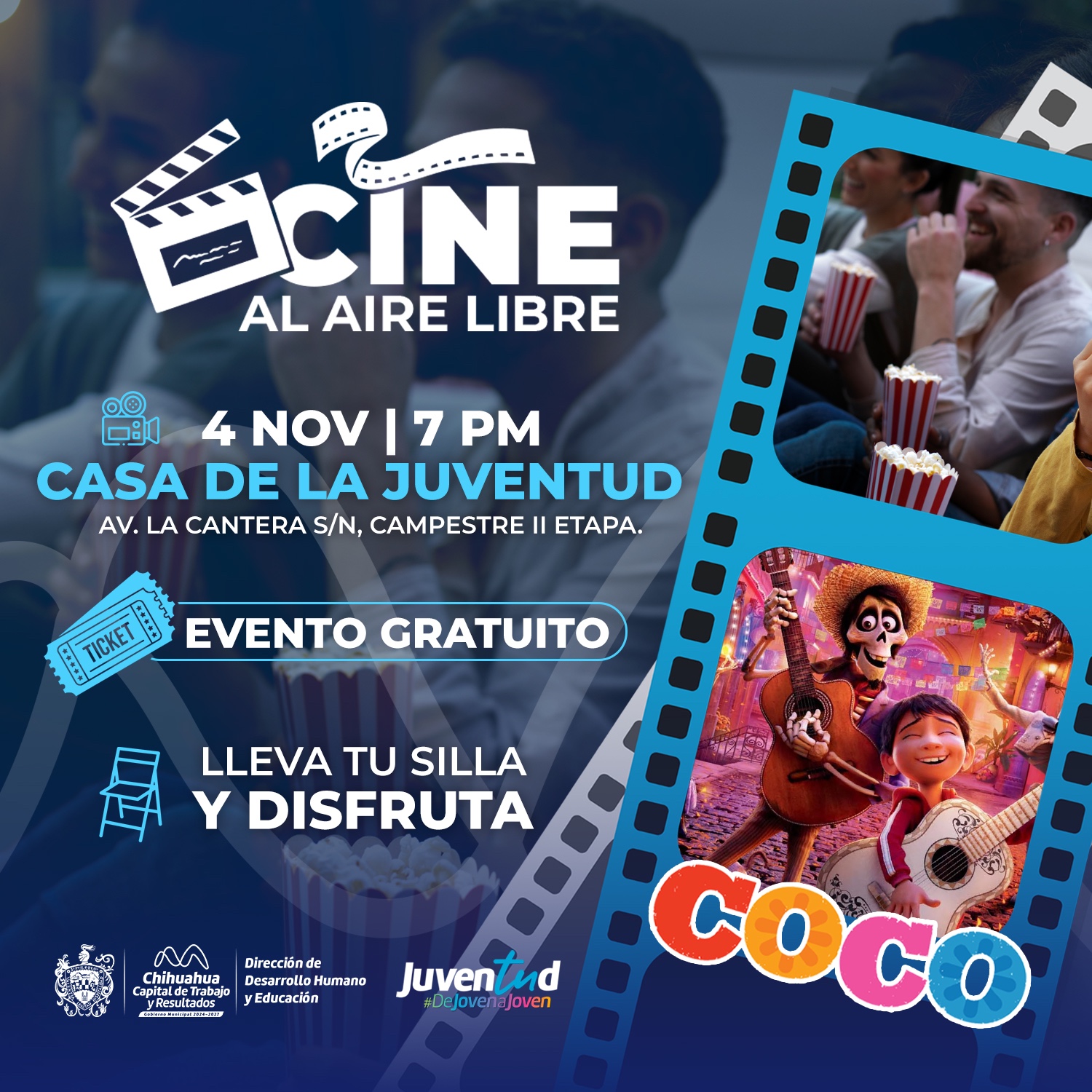 H. Ciudad de Chihuahua, Chih., a 29 de octubre de 2025.– El Gobierno Municipal de Chihuahua, a través de la Dirección de Desarrollo Humano y Educación, invita a toda la ciudadanía a disfrutar de la proyección al aire libre de la película “Coco”, el próximo 4 de noviembre de 2025 en la Casa de la Juventud ubicada en la avenida de la Cantera sin número a partir de las 19:00 horas.