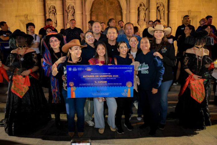 H. Ciudad de Chihuahua, Chih., a 3 de noviembre de 2025.- Como parte del festival por el Día de Muertos “El Regreso de las Ánimas”, el alcalde Marco Bonilla realizó la noche de ayer en la Plaza de Armas, la premiación a las escuelas ganadoras del concurso de altares de muertos 2025 en el que participaron escuelas de nivel básico, media superior y superior del municipio.