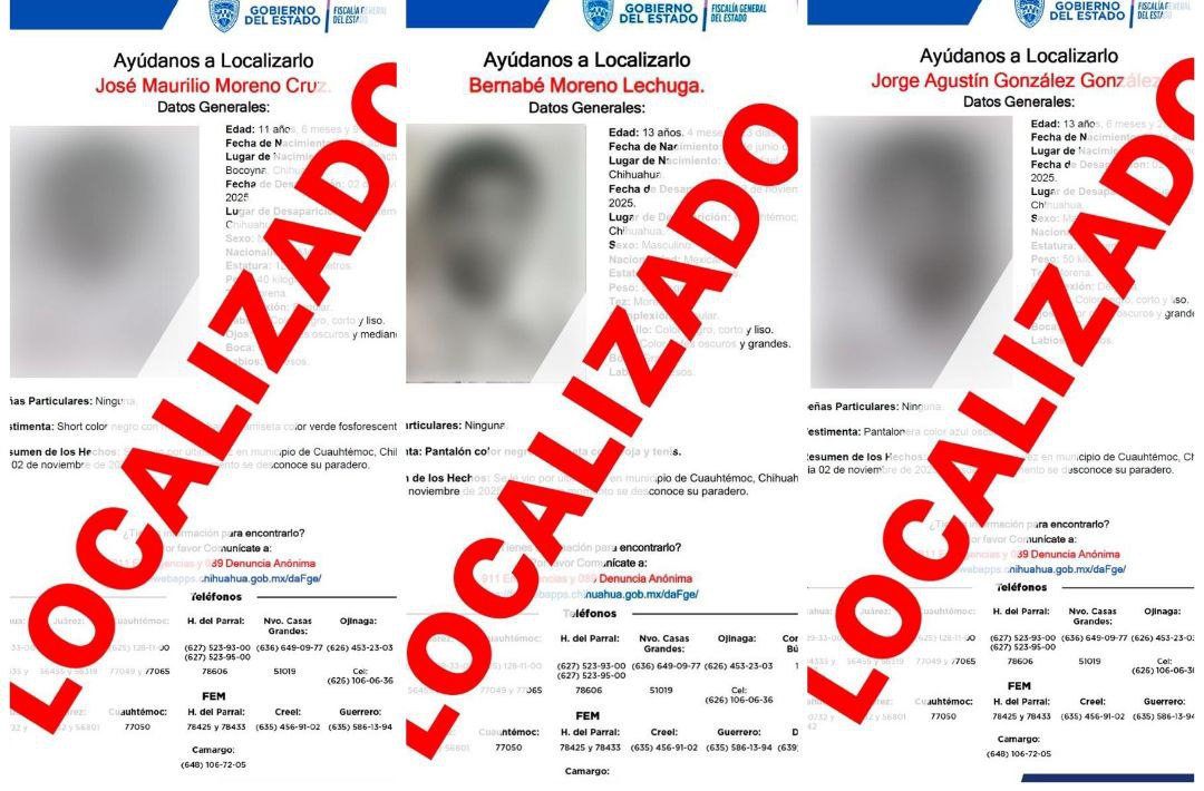 Los tres menores localizados son: Bernabé M. L., de 11 años de edad; José Maurilio M. C., de 13 años y Jorge A. G. G., de 13 años de edad, a quienes encontraron a la altura del kilómetro 12 del periférico Gómez Morín, en la ciudad de Cuauhtémoc.