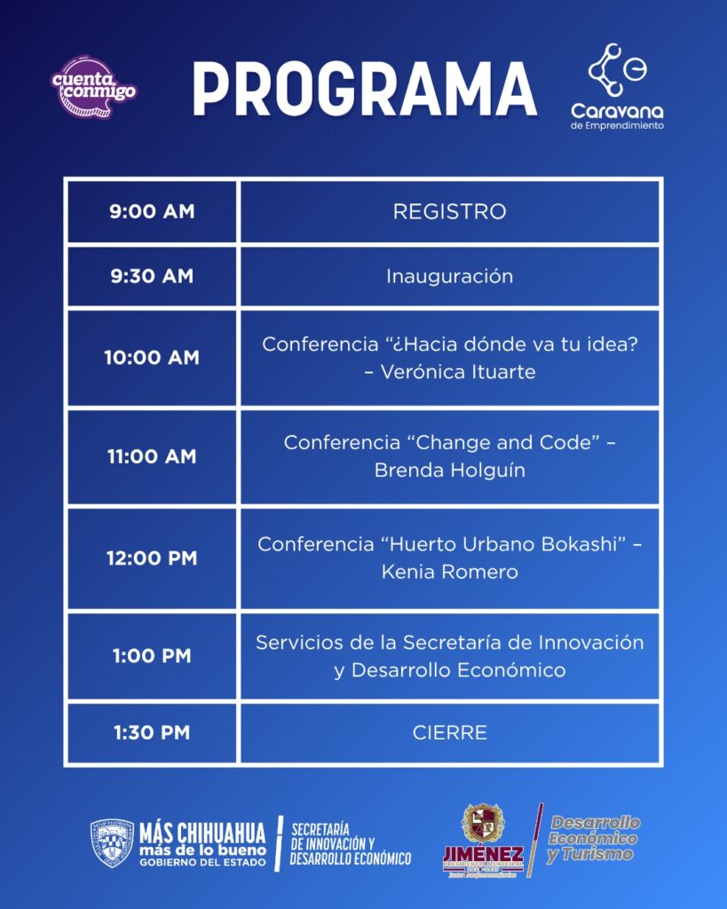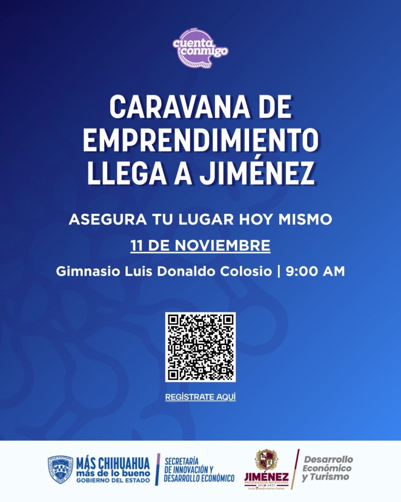 El Gobierno del Estado de Chihuahua, a través de la Secretaría de Innovación y Desarrollo Económico (SIDE), en coordinación con el Municipio de Jiménez, invita a la Caravana de Emprendimiento, que se llevará a cabo el martes 11 de noviembre en las instalaciones del Gimnasio Luis Donaldo Colosio.