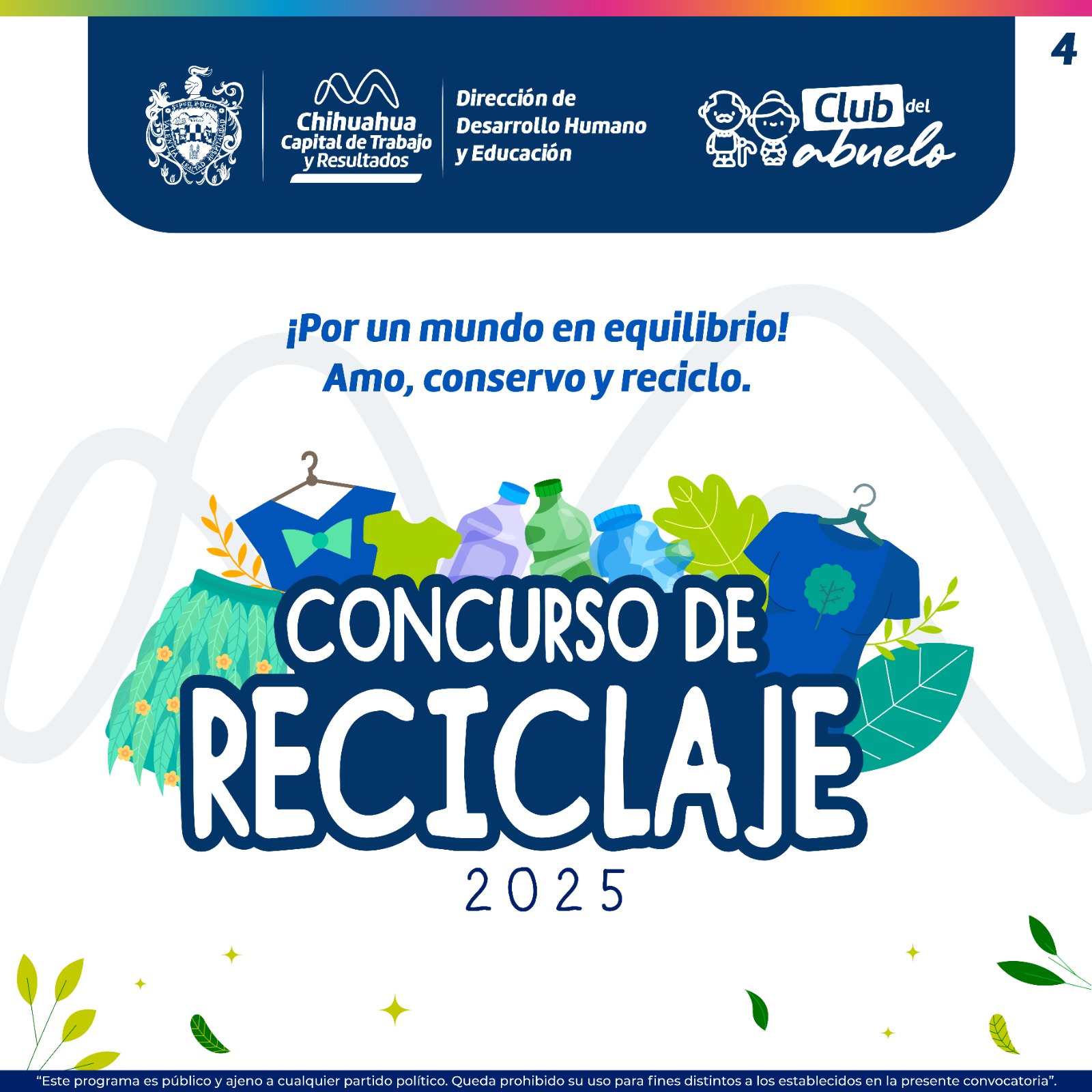 H. Ciudad de Chihuahua, Chih., a 10 de noviembre de 2025.- El Gobierno Municipal de Chihuahua, a través de la Dirección de Desarrollo Humano y Educación, invita a todos los Clubes del Abuelo del municipio a participar en el “Concurso de Reciclaje 2025”, una iniciativa que busca fomentar la creatividad y el cuidado del medio ambiente mediante la elaboración de prendas con materiales reciclados.