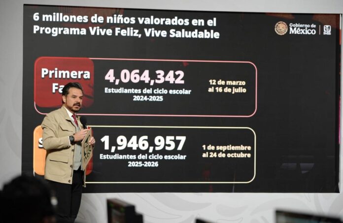 -Indicó que se han otorgado más de 374 mil consultas en el IMSS, ISSSTE e IMSS Bienestar Con la estrategia nacional Vive saludable, vive feliz que impulsa el Gobierno de México, más de 6 millones de niñas y niños que asisten a primarias públicas han recibido acciones para promover hábitos saludables y valoraciones para conocer su estado de salud