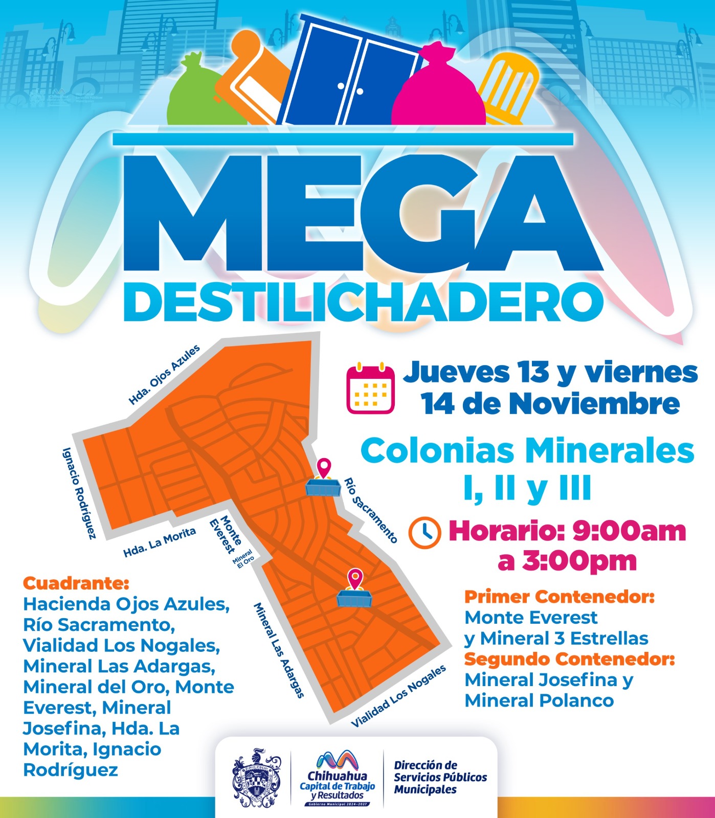 H. Ciudad de Chihuahua, Chih., a 11 de noviembre de 2025.- Con el objetivo de prevenir la proliferación de fauna nociva, así como la acumulación de objetos en viviendas o terrenos baldíos, el Gobierno Municipal, a través de la Dirección de Servicios Públicos Municipales, llevará el programa Mega Destilichadero el jueves 13 y viernes 14 de noviembre a las colonias Minerales I, II y III.