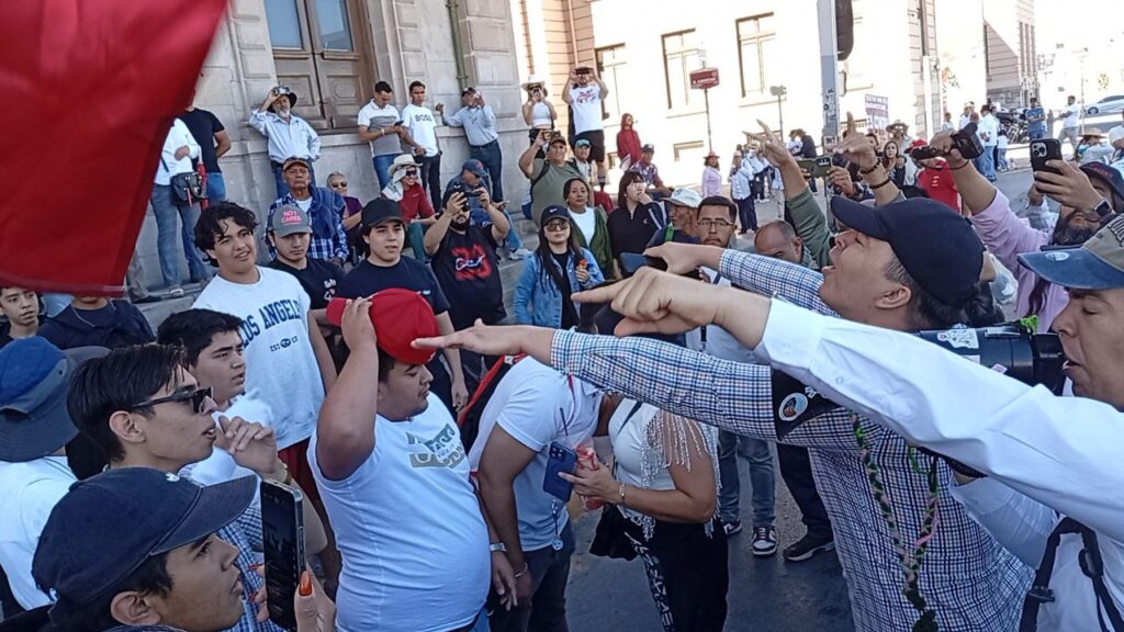 Al arribar a la altura de a Plaza del Ángel fueron recibido por algunas de las personas congregadas de las marchas previas contra la presidenta Claudia Sheinbaum Pardo y Morena con gritos de «Fuera el comunismo» y «Fuera Morena» -a lo que les contestaron que su organización no era de Morena- e incluso un hombre les lanzó una moneda y se fue, dando lugar a una pequeña confrontación y cruce de palabras, que gracias a que hubo quienes recordaron que desde el inicio se había señalado en las convocatorias que eran pacíficas, no llegó a más.
