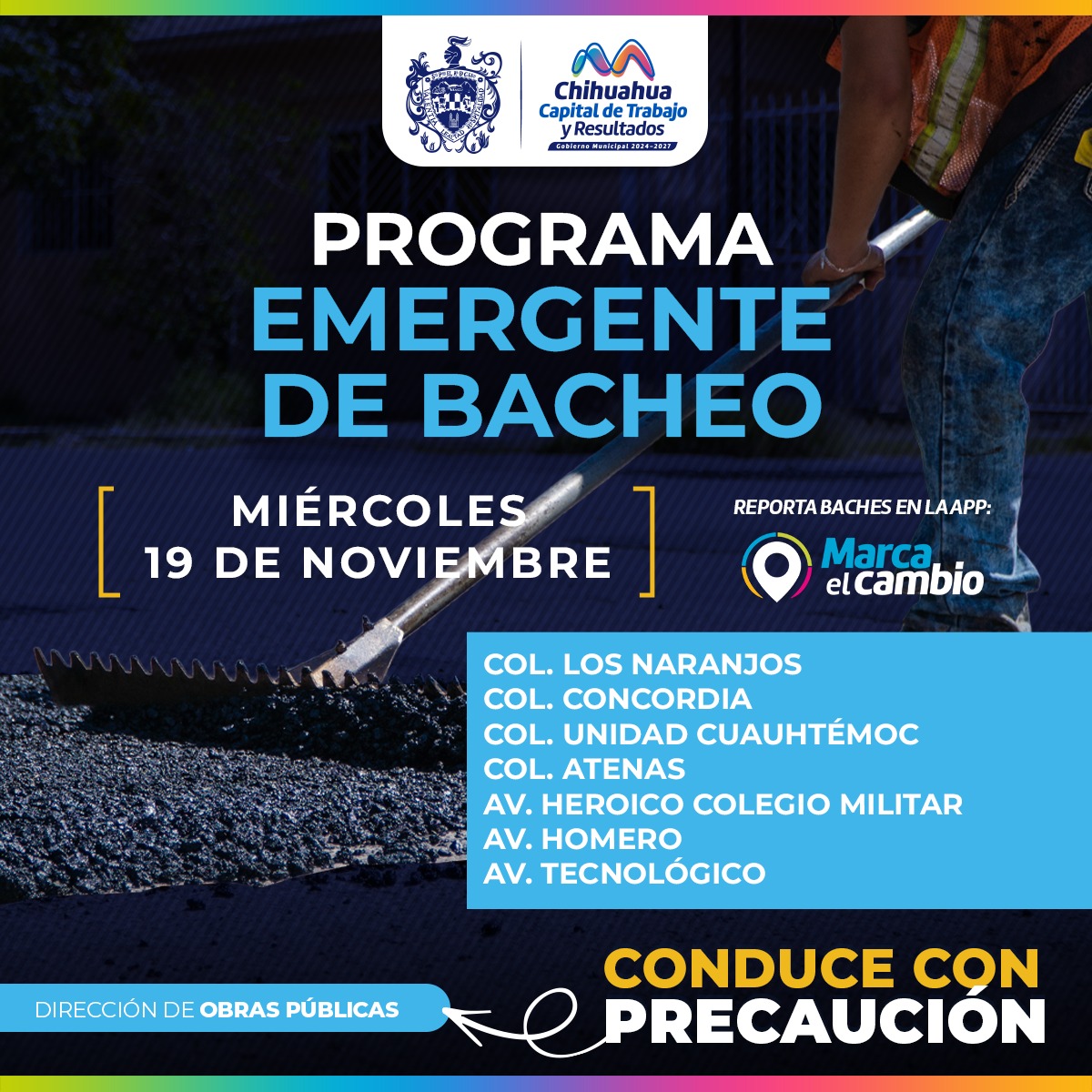 H. Ciudad de Chihuahua, Chih., a 19 de noviembre del 2025.- El Gobierno Municipal, a través de la Dirección de Obras Públicas, realizará trabajos de bacheo este miércoles 19 de noviembre, mediante el programa emergente en calles de las colonias: Los Naranjos, Concordia, Unidad Cuauhtémoc, Atenas, así como en las avenidas Heroico Colegio Militar, Homero y Tecnológico.