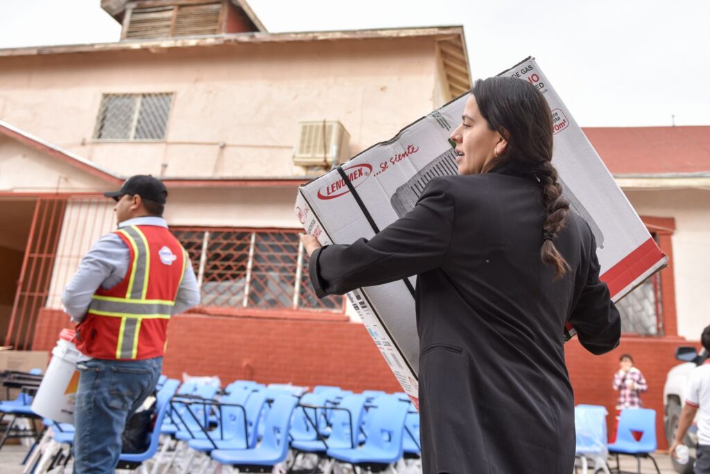La entrega incluye materiales que mejoran la calidad de estancia de estudiantes y docentes, como aires evaporativos, calentones, mesas de trabajo, butacas, pizarrones, impermeabilizante y pintura.