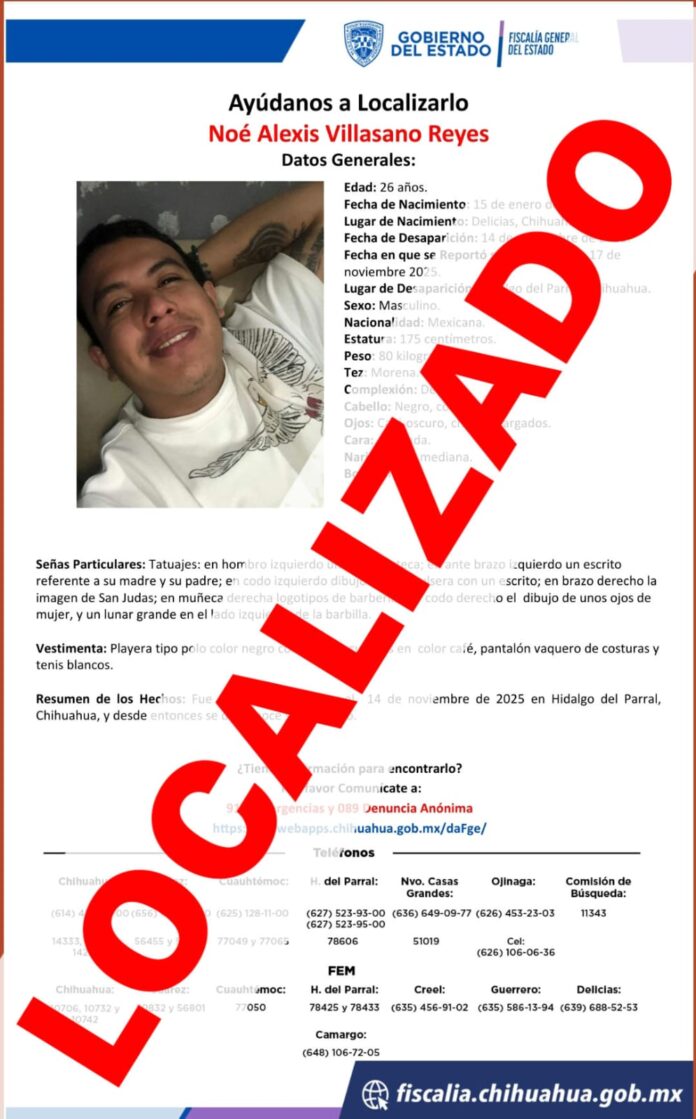 Como resultado de la activación de los protocolos de búsqueda, la Fiscalía de Distrito Zona Sur localizó sano y salvo a Noé Alexis V. R., de 26 años de edad, quien contaba con reporte de ausencia interpuesto el 17 de noviembre del presente año en la ciudad de Parral.