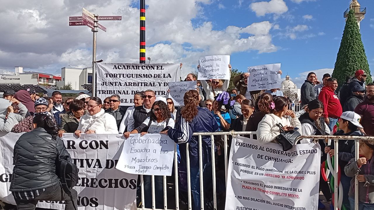 Esta mañana, maestras y maestros estatales del movimiento “Maestros en Lucha Somos L y L Plus” se apostaron con pancartas junto al templete de autoridades durante el desfile por el 115 aniversario del inicio de la Revolución Mexicana, frente a Palacio de Gobierno, para exigir solución al pendiente del pago de la Plaza de Tiempo Completo Mixto.