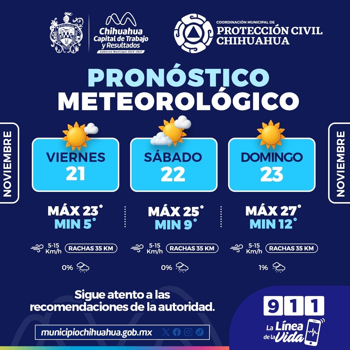 H. Ciudad de Chihuahua, Chih., a 21 de noviembre de 2025.- El Gobierno Municipal de Chihuahua, a través de la Coordinación Municipal de Protección Civil, que las temperaturas se mantendrán a la baja este fin de semana y pide a la ciudadanía tomar las precauciones necesarias ante las variaciones de temperatura.