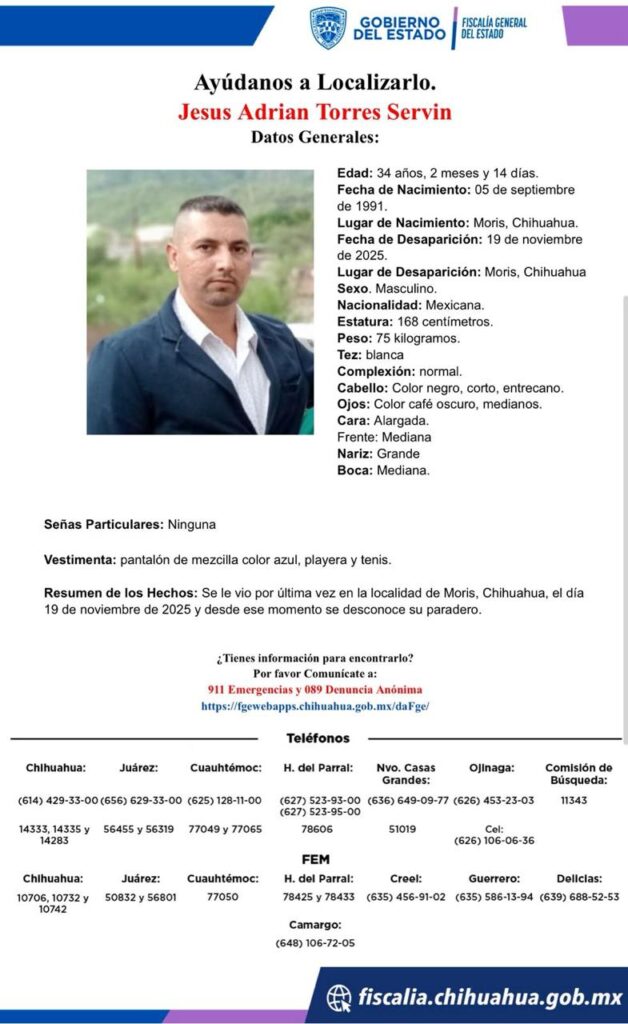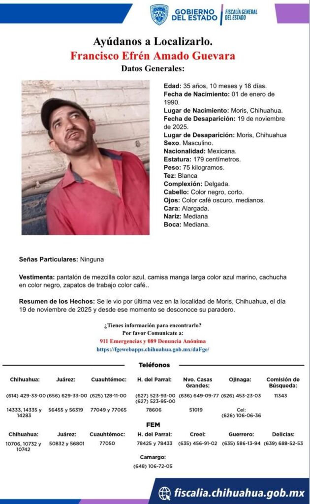 La Fiscalía de Distrito Zona Occidente, a través la Agencia Estatal de Investigación (AEI), realiza diversas acciones para la búsqueda y localización de tres masculinos con reporte de desaparición y/o ausencia, interpuesto el 19 de noviembre de 2025, en el municipio de Moris.
