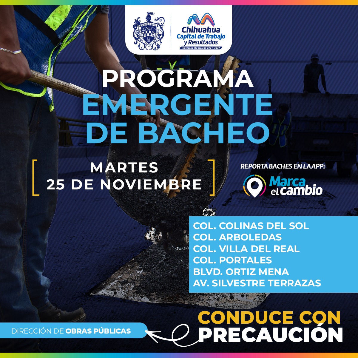 H. Ciudad de Chihuahua, Chih., a 25 de noviembre del 2025.- El Gobierno Municipal, a través de la Dirección de Obras Públicas, realizará trabajos de bacheo este martes 25 de noviembre, mediante el programa emergente en calles de las colonias: Colinas del Sol, Arboledas, Villa del Real, Portales, así como en el boulevard Ortiz Mena y la avenida Silvestre Terrazas.