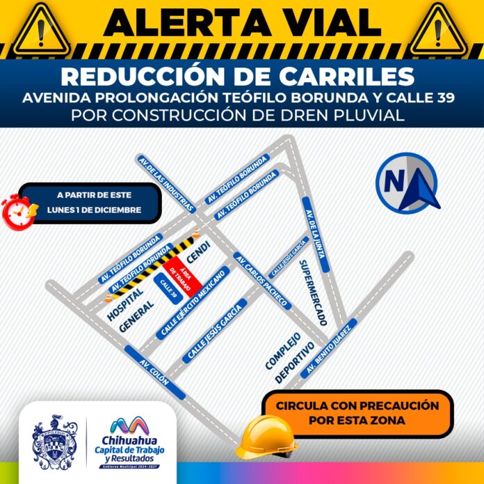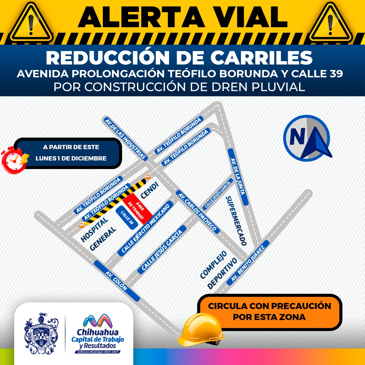 Cabe señalar que el carril lateral de la avenida prolongación Teófilo Borunda, a la altura del Hospital General de Chihuahua “Dr. Salvador Zubirán Anchondo”, con dirección hacia la avenida Carlos Pacheco, se encuentra actualmente en intervención. Se exhorta a la ciudadanía a circular con precaución en la zona.