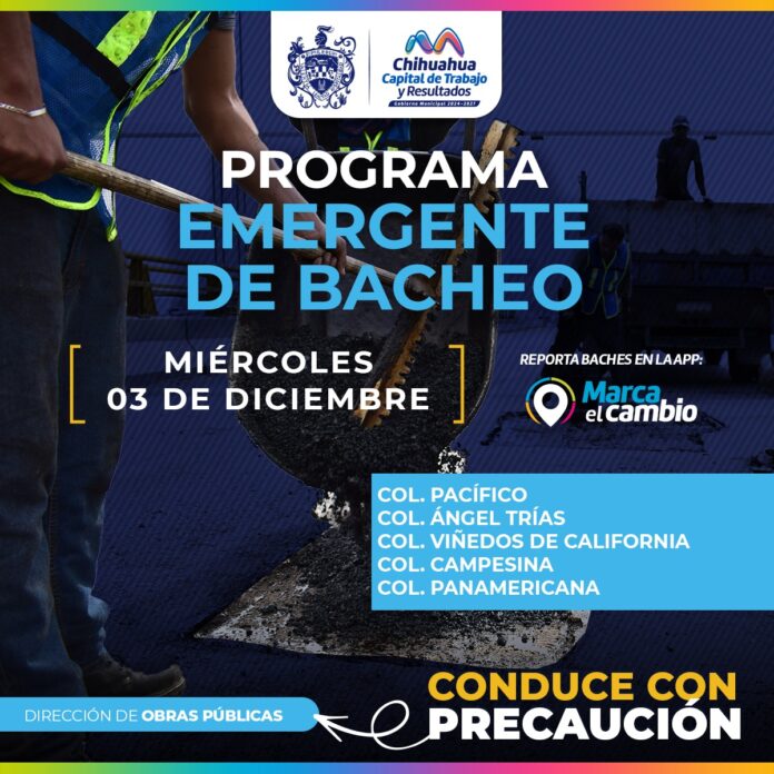 H. Ciudad de Chihuahua, Chih., a 3 de diciembre del 2025.- El Gobierno Municipal, a través de la Dirección de Obras Públicas, realizará trabajos de bacheo este miércoles 3 de diciembre, mediante el programa emergente en calles de las colonias: Pacífico, Ángel Trías, Viñedos de California, Campesina y Panamericana.