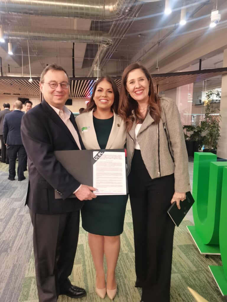 La firma se efectuó en el Work Lab Santander, con la participación de David Stofenmacher, rector de UTEL; Gabriela Capurro, directora de Empleabilidad; y el representante Legal Daniel Lázaro Díaz; y por parte de la UT Paquimé, Jimena Nevárez Apodaca, secretaria de Vinculación.