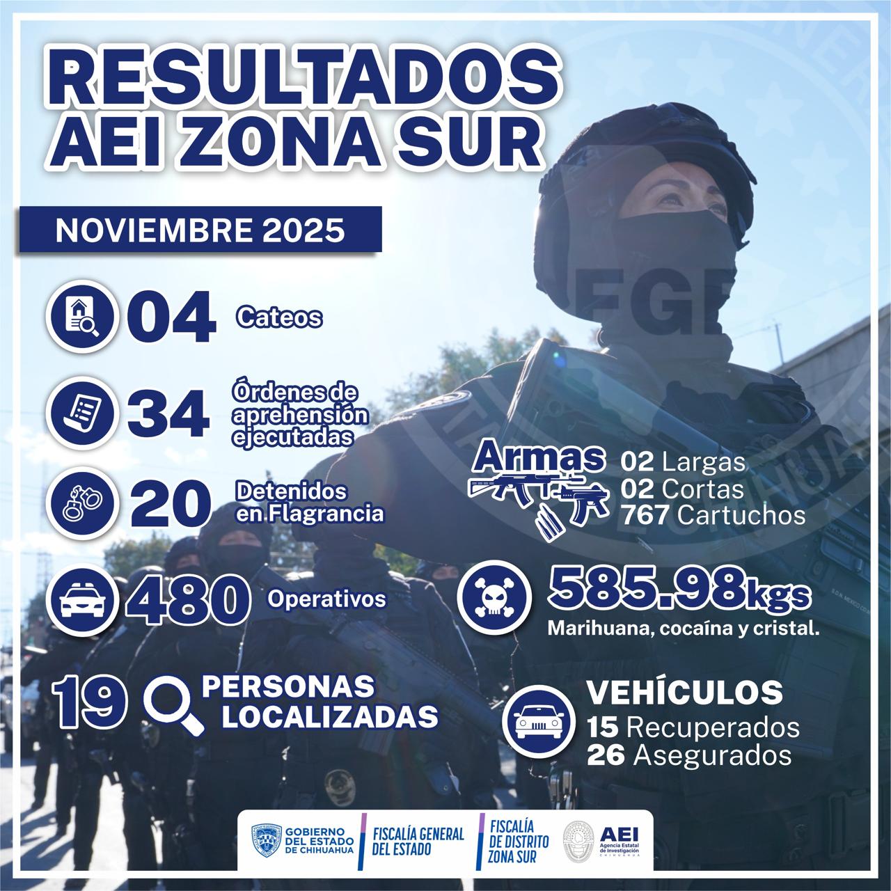 Como parte de los resultados obtenidos en el combate a los delitos Derivado de las acciones de combate frontal de los delitos, la Agencia Estatal de Investigación (AEI), logró importantes resultados durante el mes de noviembre del presente año, en los municipios que comprenden la Fiscalía de Distrito Zona Sur.
