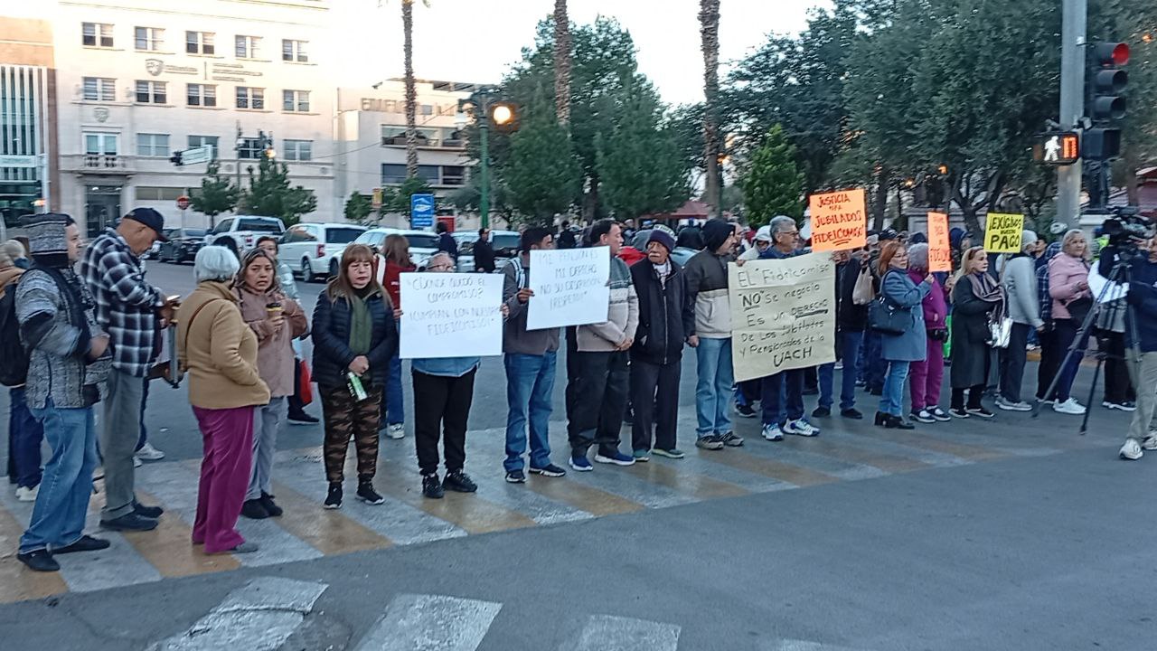 Desde las ocho de la mañana jubilados administrativos de la Universidad Autónoma de Chihuahua cerraron las calles Escorza y Aldama en protesta porque “se acabó el fideicomiso” y no recibieron ni la mensualidad ni el aguinaldo correspondiente. Los inconformes, alrededor de 550 a 560 afectados, exigen a la UACH renovar el fideicomiso que afirman cubría prestaciones que no paga ni Pensiones Civiles ni la propia institución al momento de jubilarse.