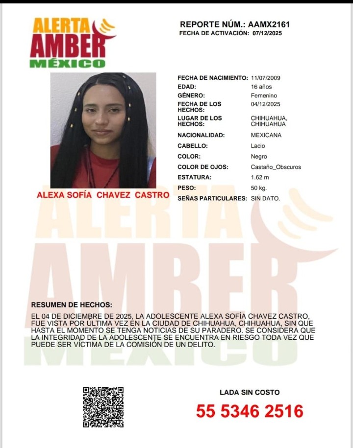 La Fiscalía General del Estado activó una Alerta Amber ante la desaparición de Alexa Sofía Chávez Castro, adolescente de 16 años de edad, quien fue vista por última vez el pasado 4 de diciembre en la colonia Mármol III, al sur de la ciudad de Chihuahua. Hasta el momento, no se reportan avances públicos sobre su localización.