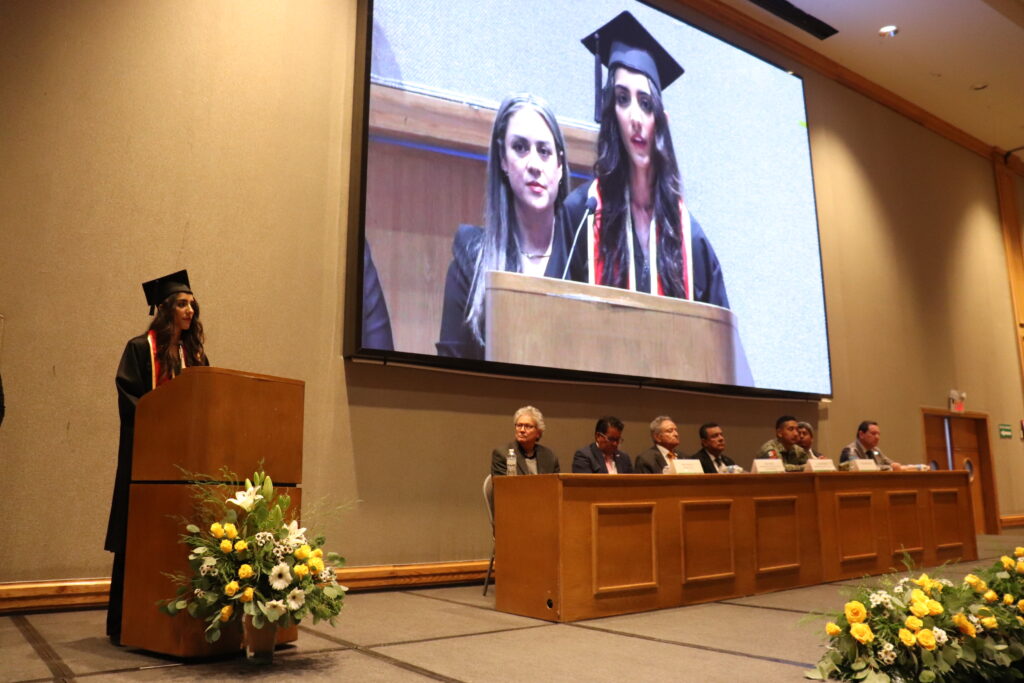 El discurso generacional estuvo a cargo de Dulce Alejandra Espino, egresada de la Ingeniería en Mecatrónica, quien deseó paciencia y perseverancia a sus compañeras y compañeros para alcanzar sus metas.