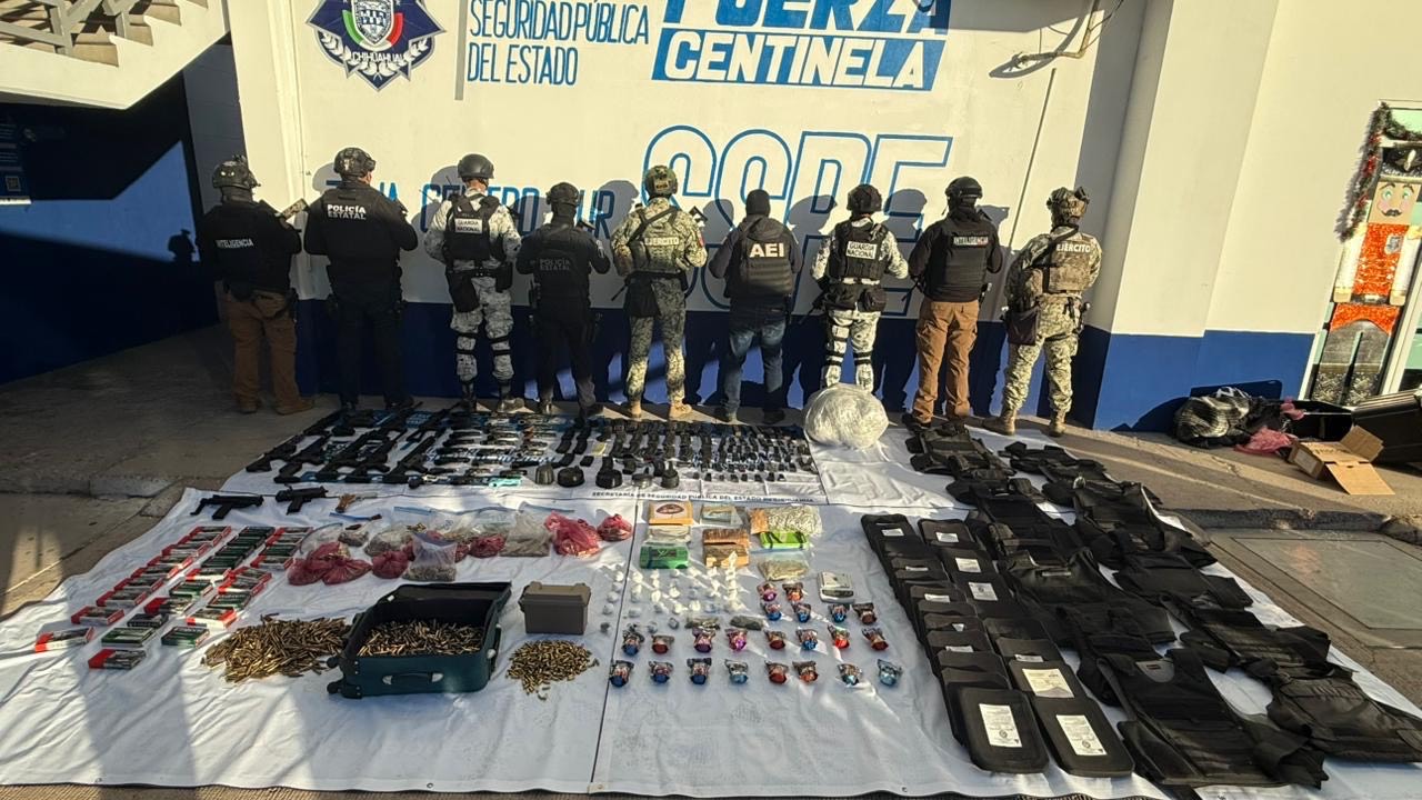 Durante el reconocimiento del inmueble, y tras observar desde el exterior indicios evidentes de actividades ilícitas, se aseguró un arsenal compuesto por 9 armas largas, 30 armas cortas, 36 cargadores para arma larga, 60 cargadores para arma corta, 5 cargadores de tambor, aproximadamente 5 mil cartuchos útiles, 14 chalecos balísticos y 25 placas balísticas.
