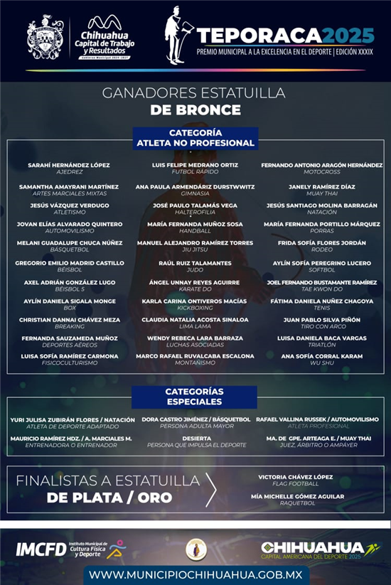 Para esta edición número 39 que contempla ciclo de competencias de diciembre 2024 a noviembre 2025, serán entregadas 38 estatuillas de bronce que reconoce a los mejores exponentes de sus disciplinas y categorías especiales. Como finalistas al oro y plata por logros más destacados están Mía Michelle Gómez Aguilar de ráquetbol y Victoria Chávez López de flag football.