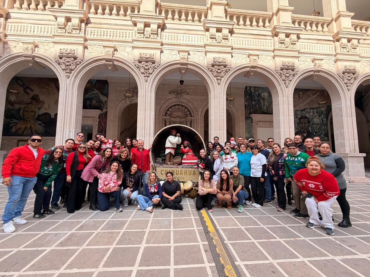 El departamento de Relaciones Públicas del Gobierno del Estado difundió una fotografía grupal con motivo de las celebraciones navideñas, en la que se observa al personal del área reunido en un ambiente institucional.