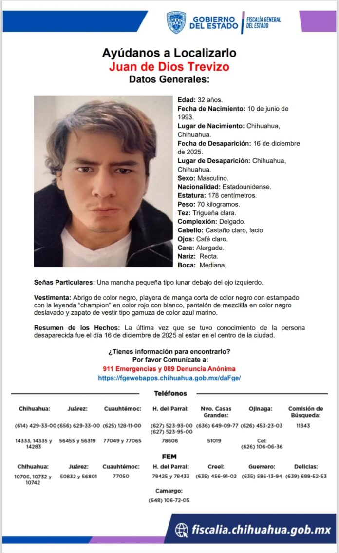 La Fiscalía General del Estado de Chihuahua emitió una ficha de búsqueda para localizar a Juan de Dios Trevizo, de 32 años de edad, quien fue reportado como desaparecido desde el pasado 16 de diciembre de 2025 en la ciudad de Chihuahua.De acuerdo con la información oficial, Juan de Dios Trevizo nació el 10 de junio de 1993 en Chihuahua, Chihuahua.