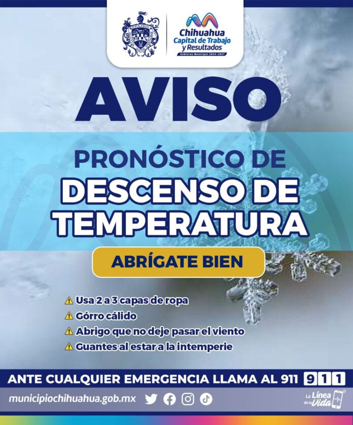 H. Ciudad de Chihuahua, Chihuahua., a 27 de diciembre de 2025.- La Coordinación Municipal de Protección Civil informa a la ciudadanía que, para el próximo lunes y martes, se prevé un descenso significativo en las temperaturas en Chihuahua Capital, por lo que se emite este aviso preventivo con el objetivo de que la población tome precauciones oportunas.