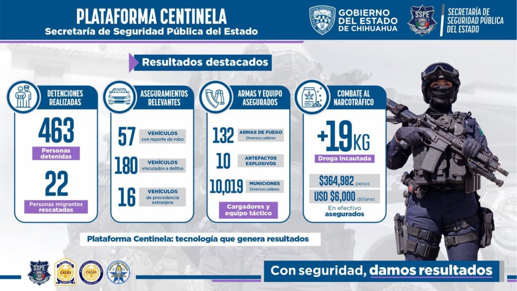 Entre los resultados más relevantes, Adrián Luis Chavira también destacó la detención de 463 generadores de violencia derivada exclusivamente del uso de la Plataforma Centinela, el rescate de 22 personas en situación de movilidad irregular, así como el aseguramiento de 57 vehículos con reporte de robo, 180 vehículos vinculados a hechos de alto impacto y 16 vehículos de procedencia extranjera.