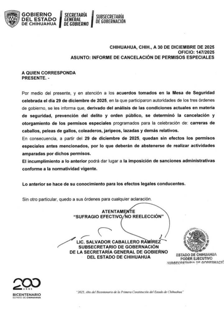 La Secretaría General de Gobierno del Estado de Chihuahua informó la cancelación de permisos especiales para la realización de diversos espectáculos y actividades tradicionales, como carreras de caballos, peleas de gallos, coleaderos, jaripeos, lazadas y eventos similares, por motivos de seguridad y orden público.