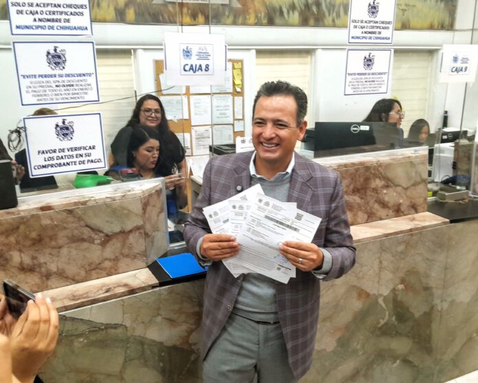 El alcalde de Chihuahua, Marco Bonilla, inició la semana realizando el pago del Impuesto Predial correspondiente a tres propiedades, con un monto total de 38 mil 201 pesos, aprovechando el descuento del 12 por ciento vigente durante el mes de enero.