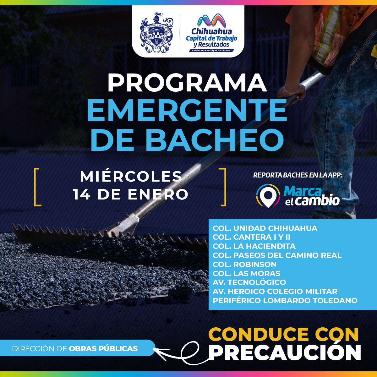 H. Ciudad de Chihuahua, Chih., a 14 de enero del 2026.- El Gobierno Municipal, a través de la Dirección de Obras Públicas, realizará trabajos de bacheo este miércoles 14 de enero mediante el programa emergente en calles de las colonias: Unidad Chihuahua, Cantera I y II, La Haciendita, Paseos de Camino Real, Robinson y Las Moras, así como en las avenidas Tecnológico, Heroico Colegio Militar y periférico Lombardo Toledano.