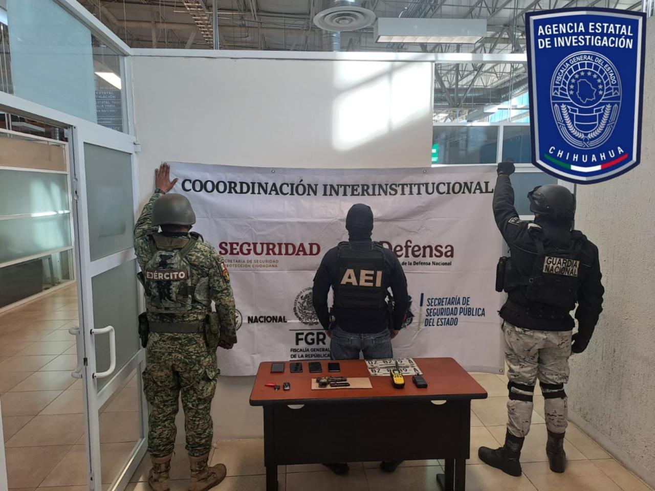 Durante la intervención, que contó con el apoyo del Ejército Mexicano y la Guardia Nacional, se aseguró una pistola tipo escuadra calibre .32, marca Colt, así como placas de circulación de los estados de Chihuahua y México, una de ellas correspondiente a una camioneta Ford Fx2 con reporte de robo vigente desde el 27 de diciembre de 2024. Además, fueron localizadas llaves de automotor y motocicleta, teléfonos celulares y equipos de radiocomunicación.